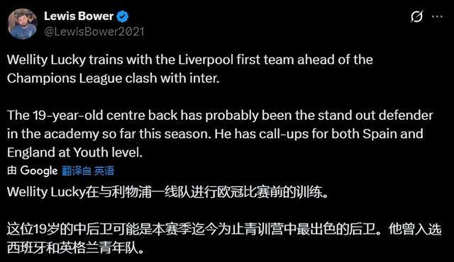 卢茨基11岁随家人搬到英国,手握西班牙+英格兰两本护照,两边青年队都征召过他,国际赛场早就证明过自己。今年10月联赛杯对水晶宫的比赛,卢茨基已上演一线队首秀。虽然那场球队输了,卢茨基却拿到了代表利物浦出战的首次正式比赛履历。这次被叫进欧冠备战,等于又往“常备名单”迈出了一步。