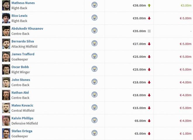 (注:榜单中未列及的球员维持原身价,本期身价没有更新)